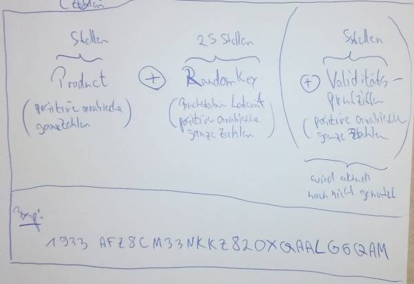 Ein Lizenzkey/Lizenzschlüsel besteht aus einem 5 stelligen Produktkey und einem 25 stelligen Zufallskey: - entgegen dem bild sind generell positive ganze arabische zahlen und latainische Großbuchstaben zur verwendung im Key zugelassen.